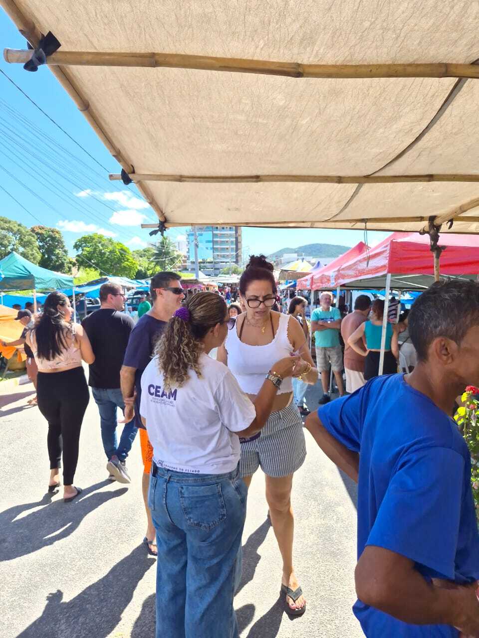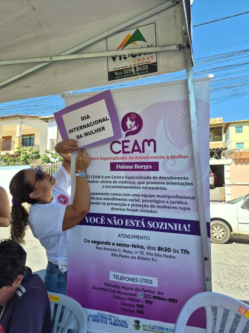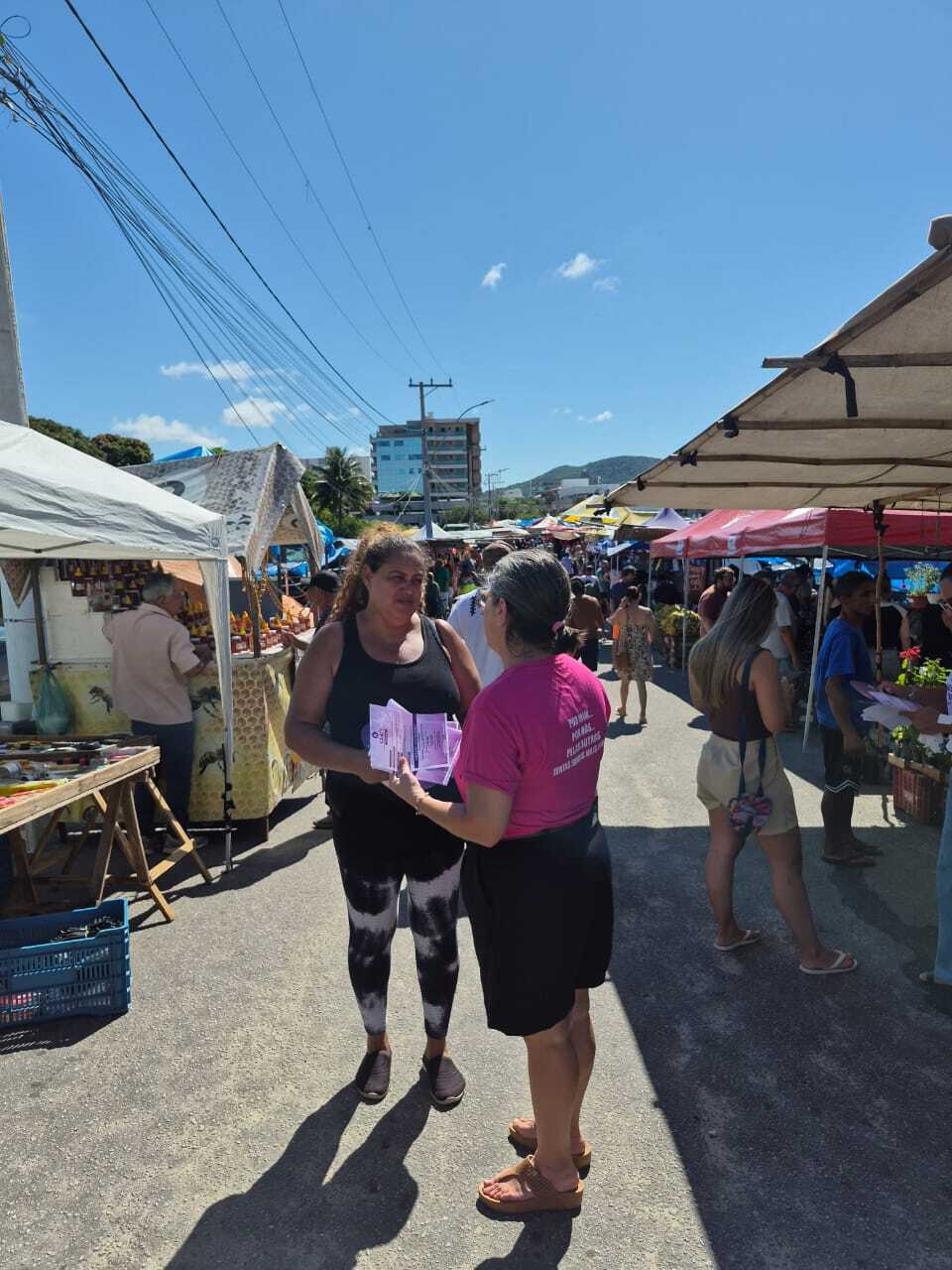 A Feira Livre de São Pedro da Aldeia recebeu uma ação especial nesta sexta-feira (06/03), em alusão ao Dia Internacional da Mulher, celebrado em 08 de março. A iniciativa foi promovida pela Secretaria Municipal de Assistência Social e Direitos Humanos, em parceria com a Secretaria Municipal de Saúde e a Firjan SENAI SESI, levando serviços de saúde, orientações e informações sobre a rede de apoio às mulheres para quem passou pelo local.