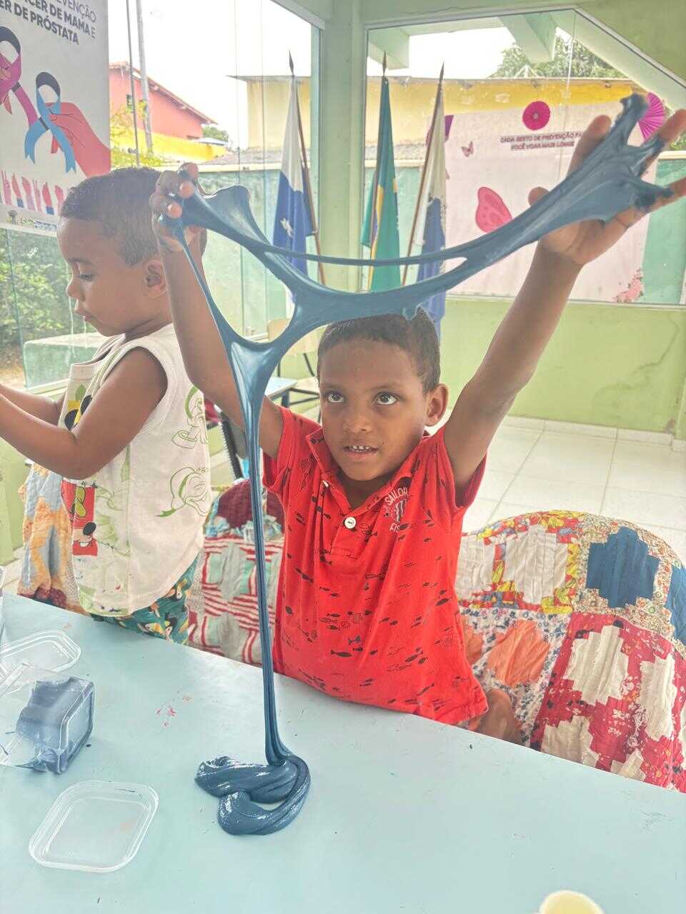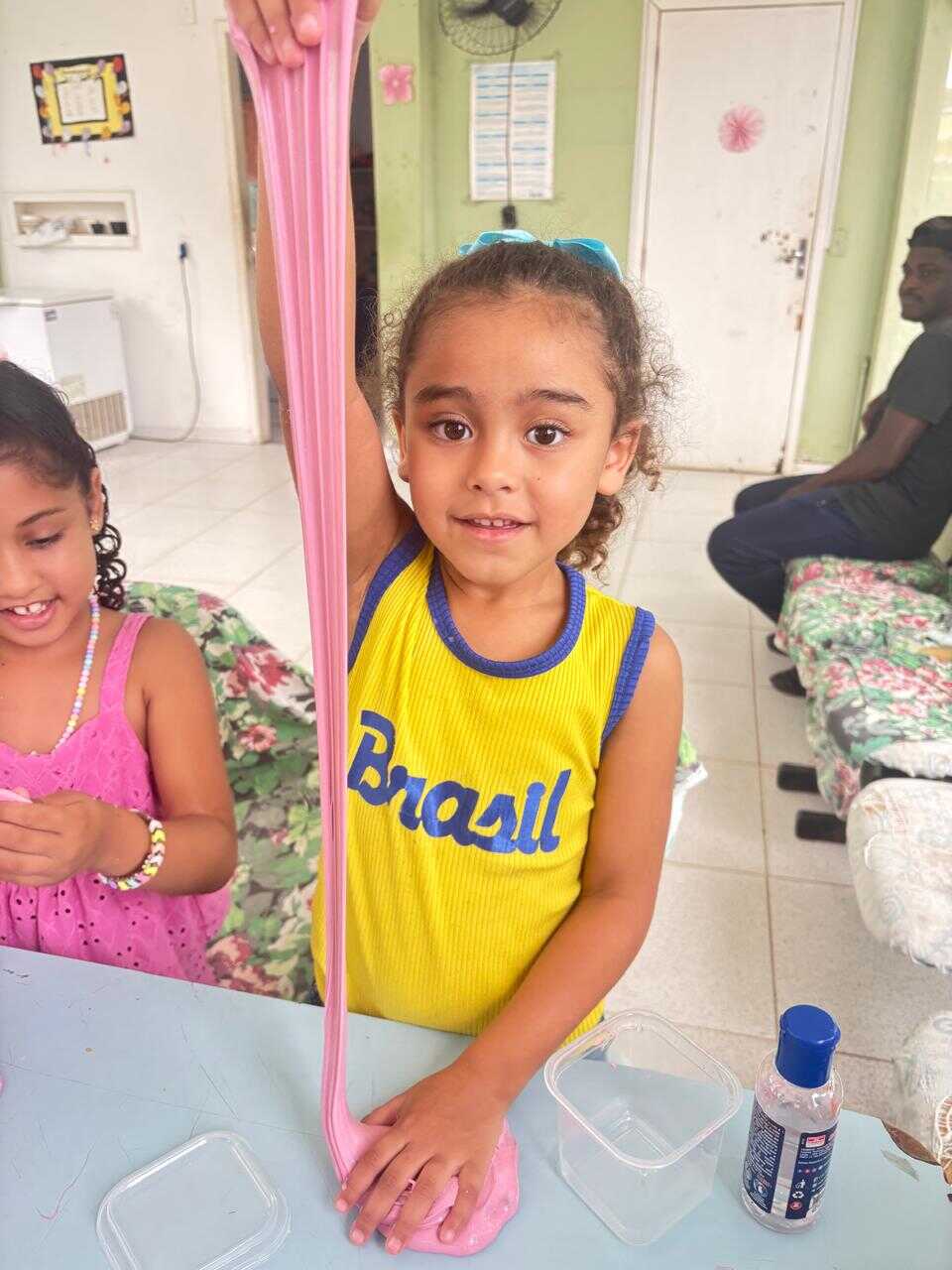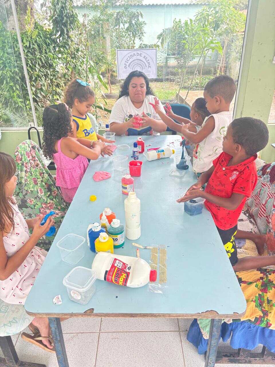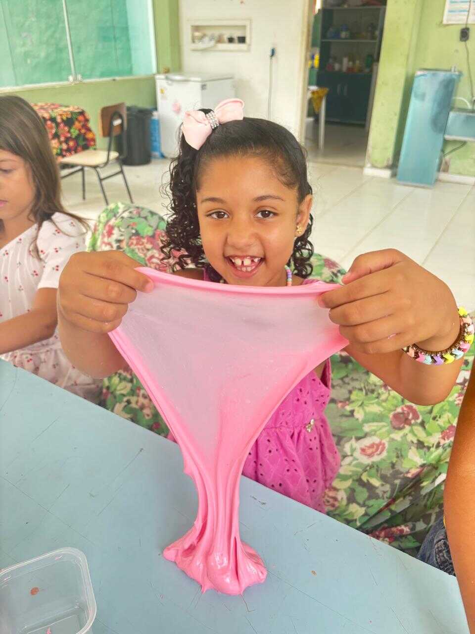 A proposta teve como objetivo proporcionar às crianças um momento lúdico e criativo, estimulando a coordenação motora, a imaginação e a socialização por meio da brincadeira. A oficina foi marcada por muita interação e entusiasmo dos participantes, que puderam produzir o próprio slime, explorando texturas e cores.