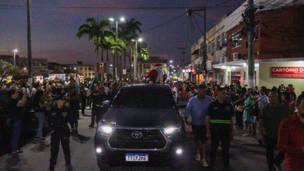 A programação começou com o cortejo natalino que saiu da Praça Hermógenes Freire da Costa em direção à Casa da Cultura. Ao som da Banda Evangélica Congregacional do Bairro São João e acompanhado pelos integrantes dos projetos culturais do município, alunos da Escola de Artes, do Ballet Municipal e da Companhia de Teatro Municipal, o Papai Noel percorreu as ruas centrais arrancando acenos e sorrisos das famílias e comerciantes que celebraram a chegada do Bom Velhinho. O desfile contou com o apoio da Guarda Civil Municipal e deu o tom da magia que marcaria toda a noite.