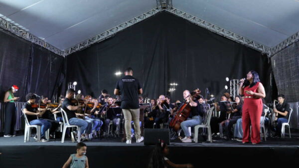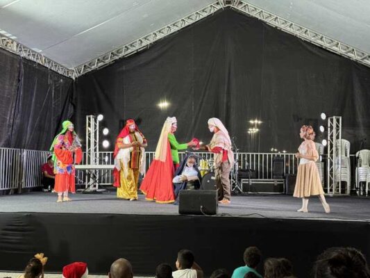 O Ballet Municipal também participou da noite com a bailarina Angelina Moraes, que subiu ao palco ao lado do coordenador Ramirez Menezes para interpretar o duo “Mar e Tu”, além de apresentar o solo clássico “The Fairy Doll”. A Companhia de Teatro Municipal emocionou o público com o Auto de Natal “O Nascimento do Salvador”, encenação que revisita, com poesia e delicadeza, a jornada da estrela do oriente, dos reis magos e da sagrada família. Fechando a programação cultural, a Orquestra Sons da Aldeia, com cerca de 48 músicos entre alunos e professores, apresentou um repertório natalino que incluiu Agnus Dei, Holy Night, Bondade de Deus e A Paz (Heal the World), arrancando aplausos calorosos da plateia.