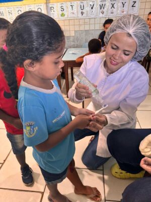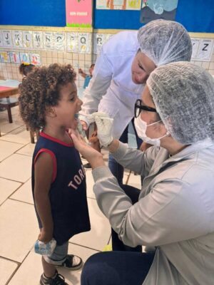 As crianças do pré-I e pré-II participaram de ações de saúde bucal, com orientações sobre a escovação correta e a importância dos cuidados diários com os dentes. Também houve aplicação de flúor e entrega de kits de higiene bucal. Já os alunos do 5º ano receberam orientações sobre higiene pessoal, com foco em hábitos simples que ajudam a prevenir doenças no dia a dia.