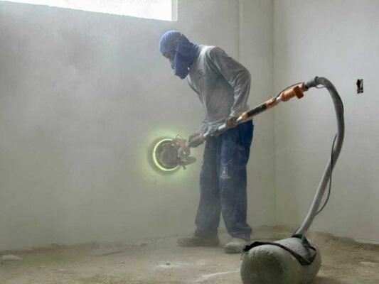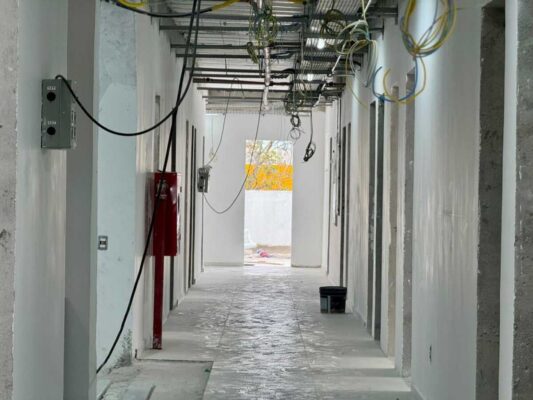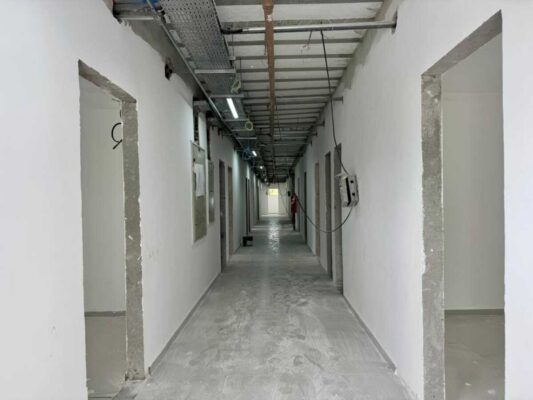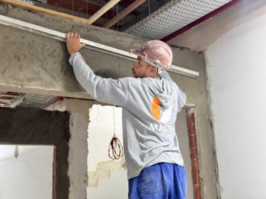 Nesta semana, as equipes atuam em diferentes frentes de trabalho, com serviços que incluem aplicação de massa e lixamento das paredes internas, instalação de pisos em todos os ambientes, execução de emboços, implantação das redes elétrica, de telefonia e de internet, além da pintura interna da unidade.