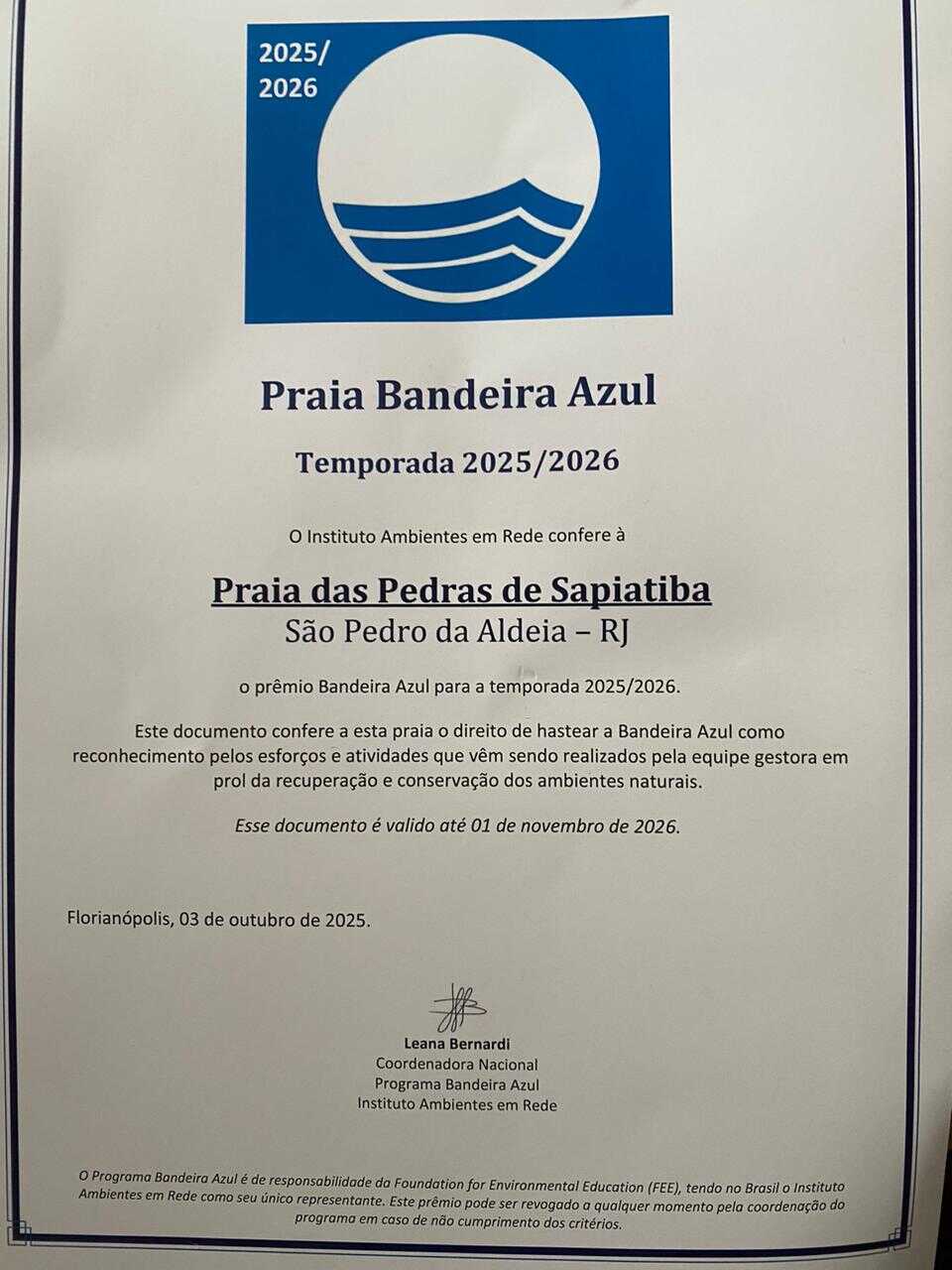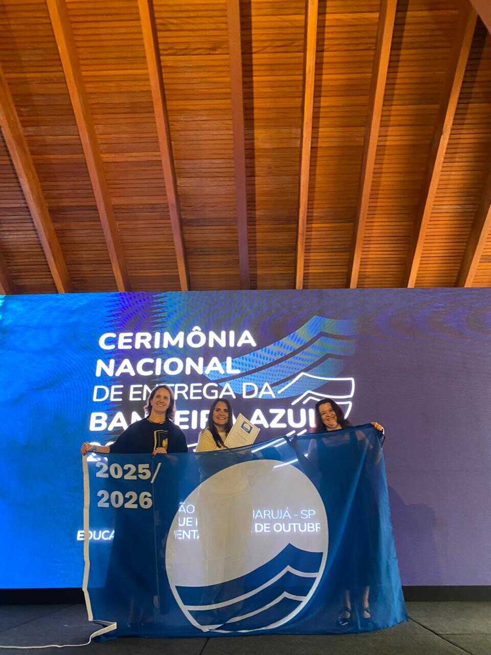 A Bandeira Azul fica em São Pedro da Aldeia por mais um ano. Em cerimônia realizada no Guarujá (SP), o município recebeu a bandeira para a temporada 2025/2026, garantindo o maior indicativo de qualidade para praias concedido pelo Instituto Ambientes em Rede (IAR). A Praia das Pedras de Sapiatiba, localizada no bairro Praia Linda, seguirá ostentando o selo por mais uma temporada, o que reforça o compromisso da atual gestão com a preservação ambiental e o turismo ecológico. Na ocasião, a servidora e bióloga Andreia Nogueira representou a Prefeitura aldeense.