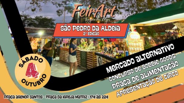 A Praça Agenor Santos (Praça da Igreja Matriz), em São Pedro da Aldeia, vai receber neste sábado (04/10), das 17h às 22h, mais uma edição da FeirArt. O evento tem apoio da Prefeitura, por meio da Secretaria Municipal de Cultura, e contará com atrações gratuitas para todas as idades, reunindo artesanato, moda, gastronomia, atrações culturais e muita diversão para a família.