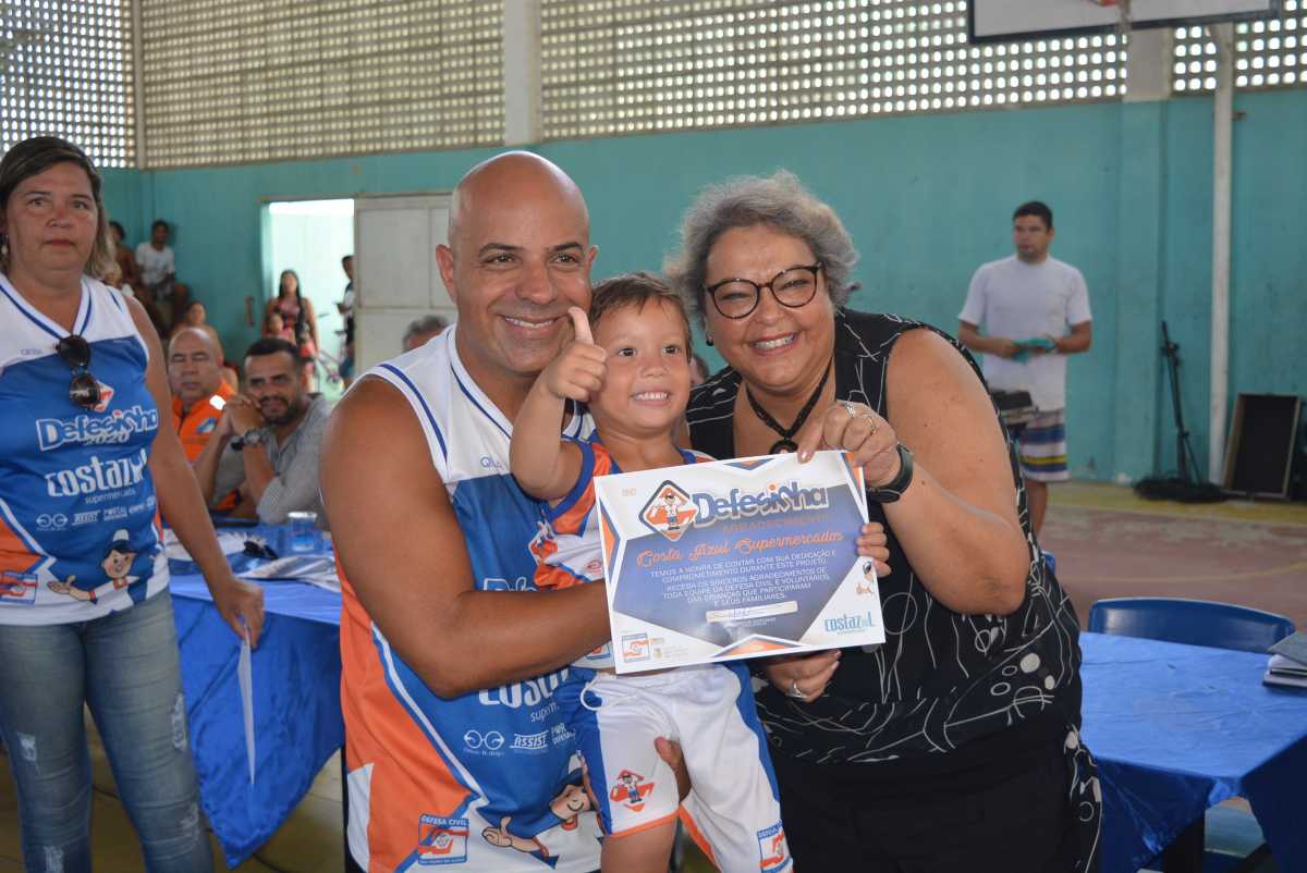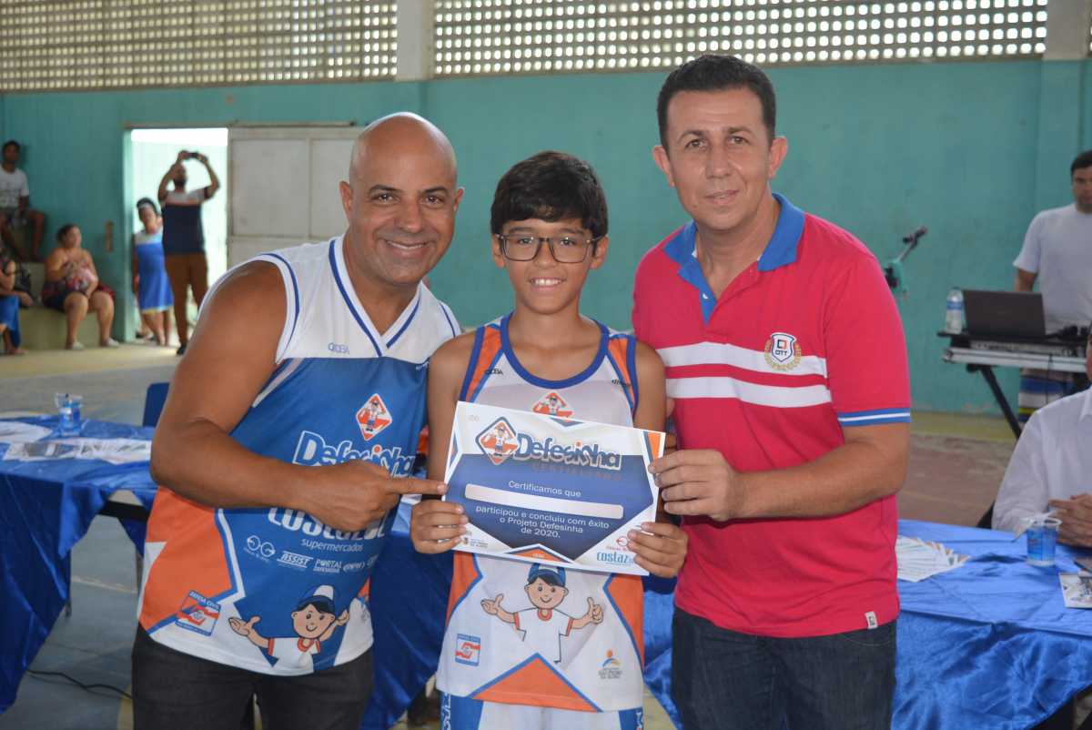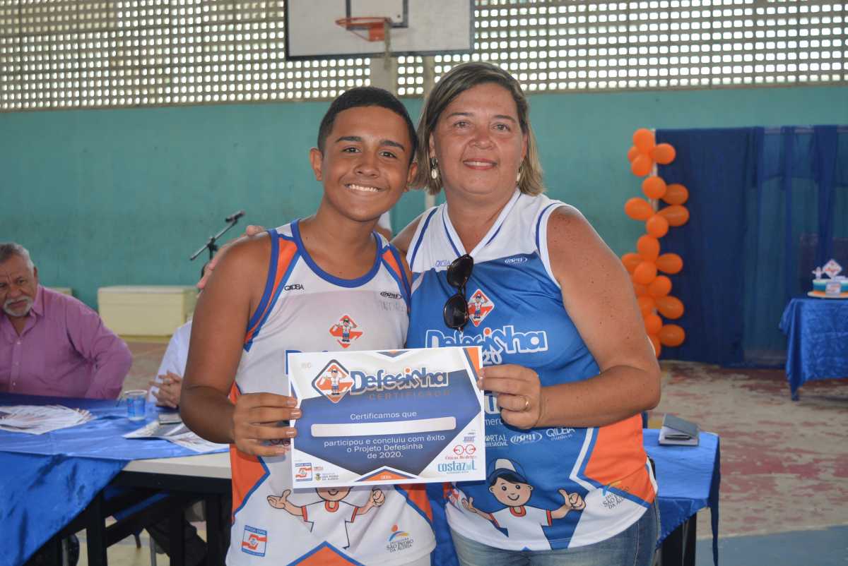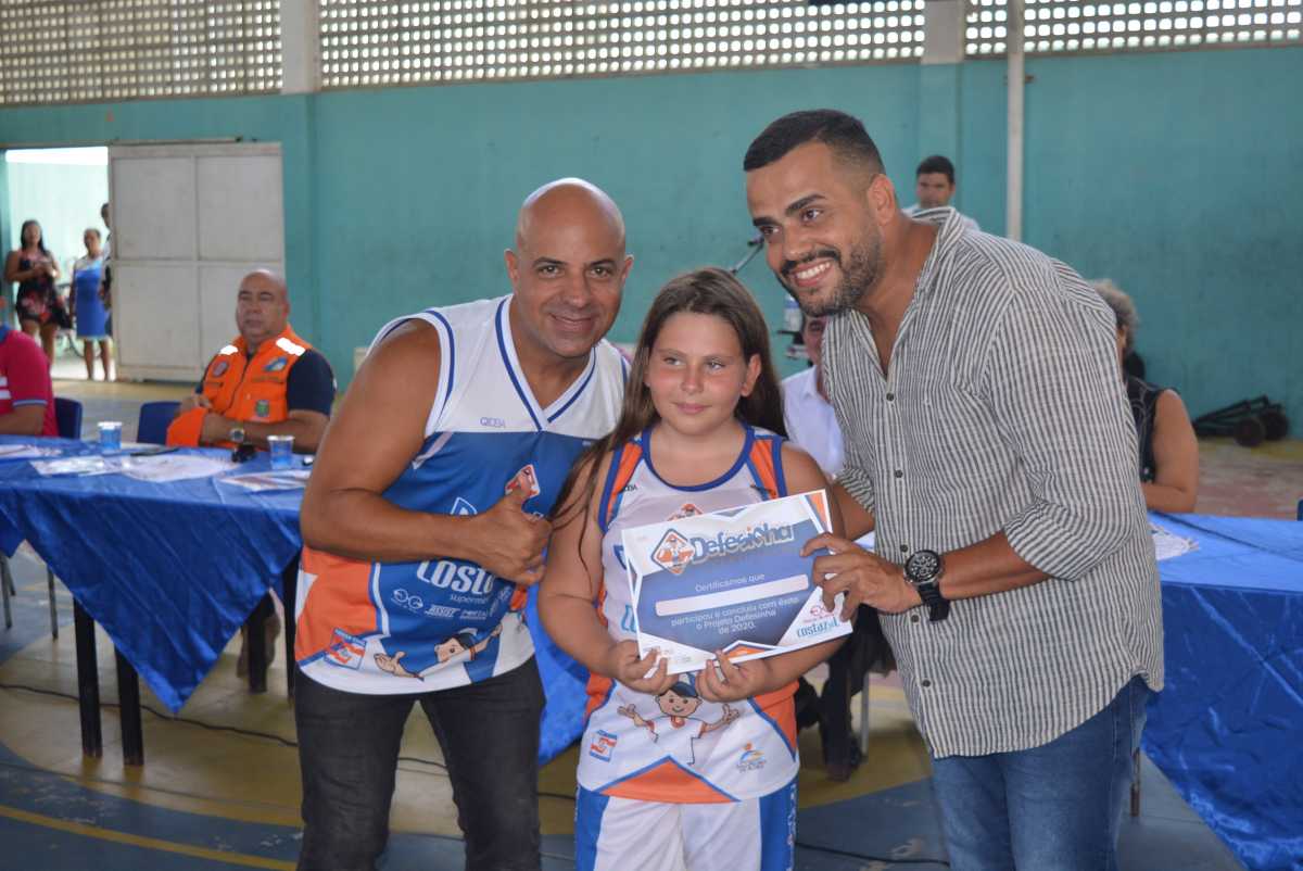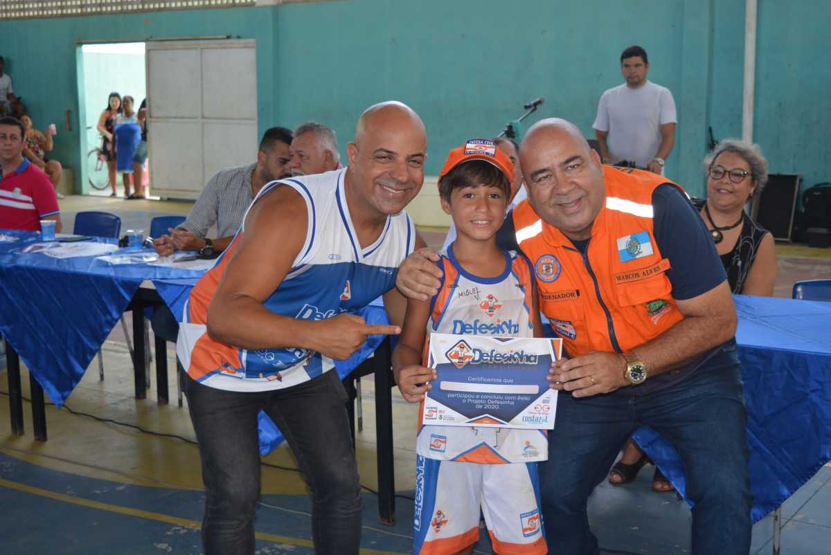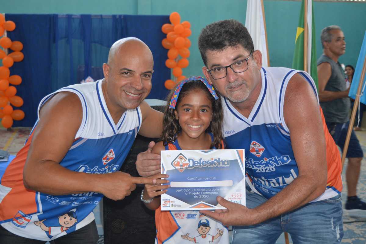 A solenidade de encerramento do Projeto Defesinha teve início com a entrega de certificados para 12 alunos, que foram sorteados para representar os pelotões “Defesinha” (04 a 06 anos de idade), “Defensores” (07 a 10 anos) e “Protetores” (11 a 14 anos). Todos os integrantes foram agraciados com a certificação ao final do evento. Os parceiros que apoiaram a realização do projeto também receberam certificados.